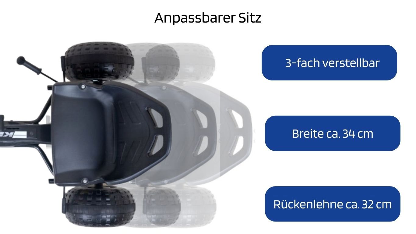 Der 3-fach verstellbare Sitz bietet mit einer 32 cm hohen Rückenlehne und einer Sitzbreite von 34 cm optimalen Halt und hohen Sitzkomfort – ideal für eine ergonomische Sitzposition und sicheres Fahrvergnügen.